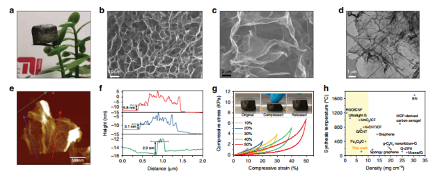 Figure 2. COF/rGO氣凝膠的結(jié)構(gòu)表征。a)放置在一片葉子上的超輕COF/rGO氣凝膠光學(xué)照片。b,c)COF/rGO的SEM圖像和d)TEM圖像。e,f)COF/rGO的AFM圖像和相應(yīng)的高度情況。g)COF/rGO氣凝膠在不同最大應(yīng)變時(shí)的應(yīng)力-應(yīng)變曲線。h)普通輕質(zhì)材料的密度和合成溫度比較。