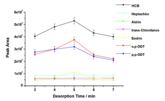 Figure 4. 七種OCP的解吸時(shí)間曲線。萃取時(shí)間25分鐘,其他萃取條件與Fig.3相同。