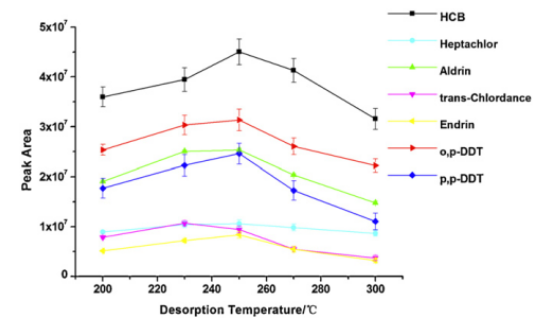 Figure 5.解吸溫度對(duì)OCPs萃取效率的影響。萃取時(shí)間25分鐘,其他萃取條件與Fig.3相同。