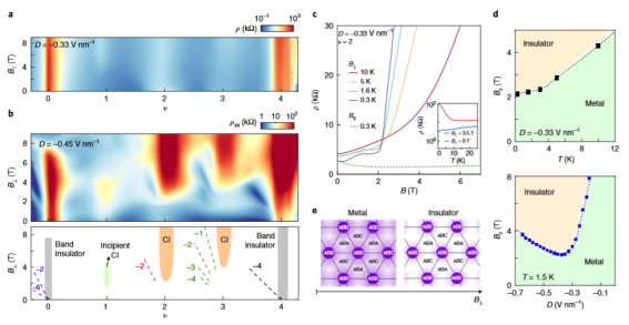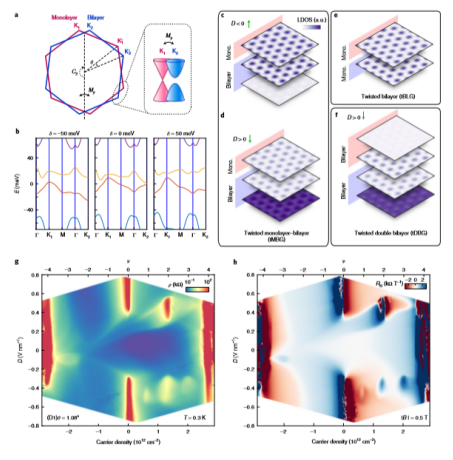近年來,具有扁平電子帶的扭曲范德瓦爾斯異質(zhì)結(jié)構(gòu),是一種可實現(xiàn)相關(guān)和拓撲狀態(tài)的平臺,具有高度的可控制和可調(diào)性。在基于石墨烯的莫爾異質(zhì)結(jié)構(gòu)中,相關(guān)的相圖和能帶拓撲取決于石墨烯層的數(shù)量以及封裝晶體的外部環(huán)境細節(jié)。在這里,我們報告了扭曲單分子雙分子層石墨烯(tMBG)系統(tǒng)具有多種相關(guān)的金屬態(tài)和絕緣態(tài),以及拓撲磁態(tài)。由于其低對稱性,當施加的垂直電場從雙層指向單層石墨烯時,tMBG的相圖近似于扭曲的雙層石墨烯;當電場反轉(zhuǎn)時,tMBG的相圖近似于扭曲的雙倍雙層石墨烯。在前一種情況下,觀察到了在臨界垂直磁場上方經(jīng)歷軌道驅(qū)動的絕緣躍遷相關(guān)態(tài)。在后一種情況下,觀察到了在導帶的四分之一填充處出現(xiàn)電可調(diào)鐵磁性,并伴有異常的霍爾效應(yīng)。在零磁場下,靜電摻雜可以改變磁化方向。我們的結(jié)果建立了一個可調(diào)的tMBG平臺來研究相關(guān)態(tài)和拓撲態(tài)。