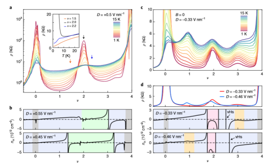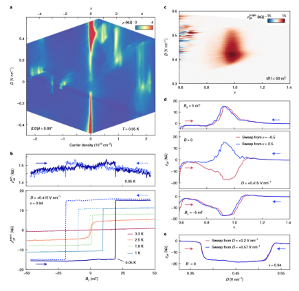 Fig. 4 在θ= 0.89°的器件中,對于D> 0,在ν= 1處的鐵磁性和aHE。