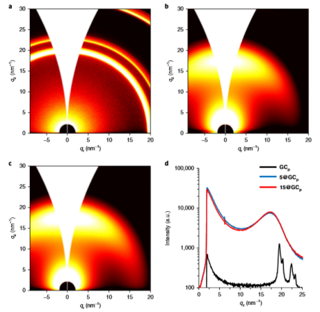 Fig. 3 低聚物-表面相互作用的2D GIWAXS。