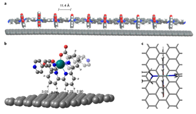 利用水作為電子來源的光電化學(xué)電池是清潔、可持續(xù)的太陽能燃料替代化石燃料的最具吸引力的解決方案之一。為此,需要掌握并正確理解多相水氧化催化。該研究還在繼續(xù)尋找一種催化劑,這種催化劑既能穩(wěn)定在電(光)陽極表面,又能有效地在所需的中性pH值下進(jìn)行反應(yīng)。在這里,通過釕結(jié)合的輔助配體和石墨表面的六角形環(huán)之間的CH - h相互作用,我們展示了如何將低聚釕配合物錨定在石墨材料表面,從而控制其分子覆蓋率。這些雜化分子材料表現(xiàn)為分子陽極,可在高電流密度下在pH 7時催化水氧化為雙氧。這種將分子催化劑錨定在石墨表面的策略,可以推廣到其他過渡金屬和其他催化反應(yīng)中。