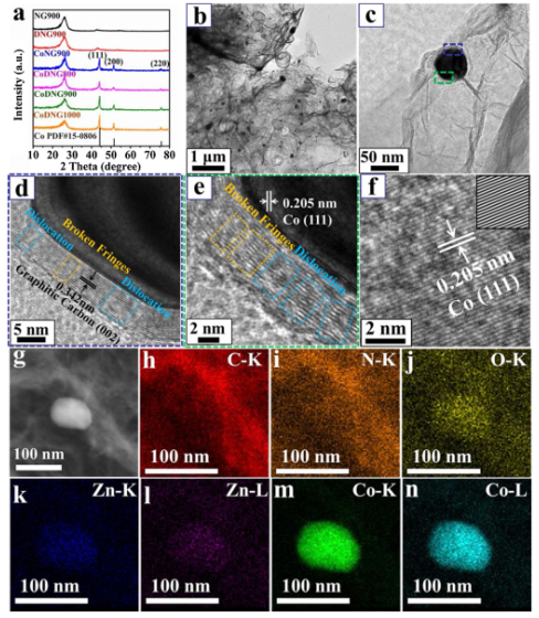 Figure 2. (a) 各種催化劑的 XRD圖, (b, c) CoDNG900的TEM圖,(d-f) HRTEM圖, (g) HAADF掃描TEM圖和(h-n)相應(yīng)的元素分布。