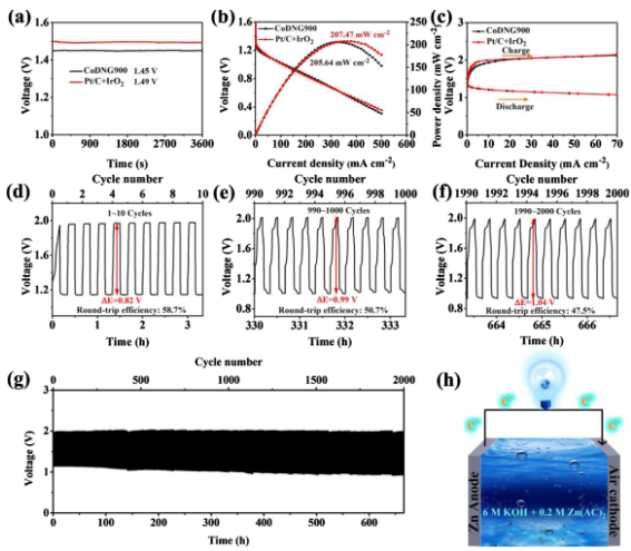 Figure 5. (a) 開路電壓時(shí)的曲線,(b) 放電極化曲線和相應(yīng)的功率密度,(c) CoDNG900 和Pt + IrO2基鋅空電池的充放電極化曲線,(d) 初始的 1˜10圈, (e) 990˜1000圈和 (f) 1990˜2000圈 恒電流充放電曲線,(g) 循環(huán)性能,(h) 鋅空電池示意圖。