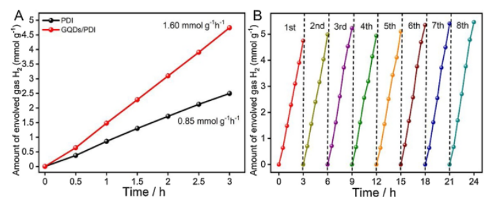 Figure 2. (A)在可見光照射下(687 mw/cm2),純PDI和GQDs/PDI-14%的時(shí)間相關(guān)的析氫產(chǎn)率,(B)析氫反應(yīng)的循環(huán)圈數(shù)。