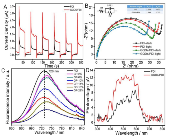 Figure 4. (A)可見光下PDI和GQDs/PDI-14%的光電流,(B)EIS圖,(C)光催化劑的發(fā)射光譜(PL),(D)PDI和GQDs/PDI-14%的SPV光譜。