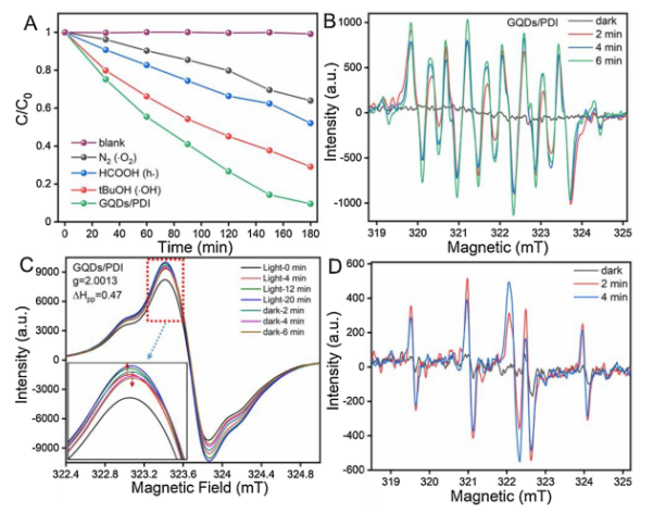 Figure 5. (A) GQDs/PDI-14%在可見光下降解苯酚的自由基捕獲實(shí)驗(yàn),(B) 檢測(cè)O2