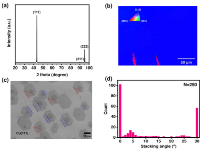 根據(jù)兩層石墨烯之間的疊加角度,雙層石墨烯(BLG)表現(xiàn)出獨(dú)特的性能。盡管可以通過化學(xué)氣相沉積(CVD)獲得具有0°和30°的堆疊角度的BLG,Cu表面對(duì)確定疊加角的影響尚不清楚,而通過這種影響可以進(jìn)一步精細(xì)地控制疊加角。在這里,我們報(bào)道的Cu催化劑的晶面在選擇BLG的堆疊角度中起關(guān)鍵作用,并提供實(shí)驗(yàn)和計(jì)算證據(jù),表明原子平坦的Cu(111)表面產(chǎn)生的堆疊角為0°和30°,而原子階梯狀Cu (311)和Cu (110)表面則產(chǎn)生較小堆疊角,其BLGs為3–5°,是CVD的主要產(chǎn)品。