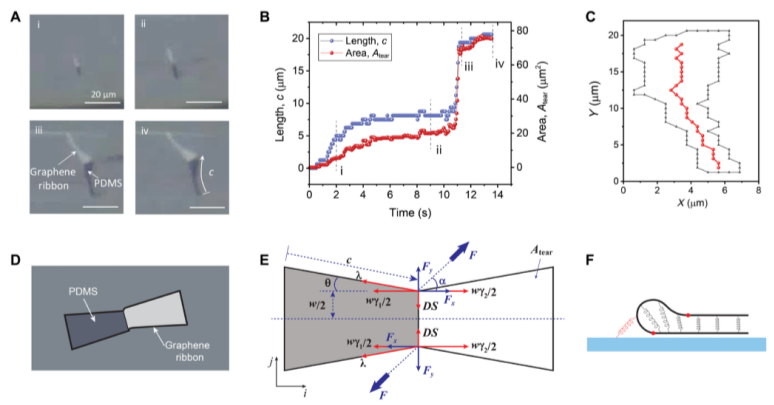 石墨烯通常通過弱范德華(vdW)相互作用與其他材料接觸。特別令人感興趣的是石墨烯-聚合物界面,該界面在包括柔性電子產(chǎn)品和多功能涂料在內(nèi)的各種應(yīng)用中不斷受到動態(tài)負(fù)載的影響。通過原位循環(huán)載荷,我們直接觀察到了石墨烯-聚合物界面的界面疲勞擴(kuò)展,發(fā)現(xiàn)該界面滿足修正的Paris定律。此外,通過結(jié)合平面內(nèi)剪切和平面外撕裂機(jī)制,通過vdW接觸產(chǎn)生的周期性載荷甚至能夠?qū)е略际┑钠跀嗔选<羟袛嗔阎饕l(fā)生在循環(huán)載荷引起的褶皺連接處,并平行于載荷方向傳播。進(jìn)行斷裂力學(xué)分析,發(fā)現(xiàn)了循環(huán)加載過程中石墨烯異乎尋常的自撕裂行為動力學(xué)。這項(xiàng)工作為石墨烯和石墨烯-聚合物界面的動態(tài)可靠性提供了機(jī)械上的見解,這將有助于石墨烯基結(jié)構(gòu)的持久設(shè)計(jì)。