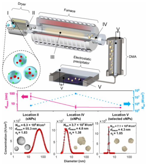 Fig. 1. 用于連續(xù)催化劑NP生成,尺寸選擇和收集的實驗裝置。