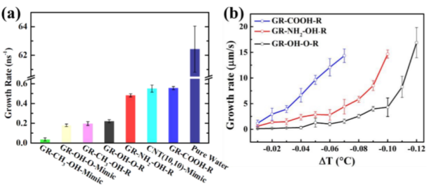 3–OH–Mimic到環(huán)氧、羥基改性的石墨烯到胺、羥基改性的石墨烯到羧基改性的石墨烯,對(duì)冰生長的抑制作用均有所減弱。這個(gè)序列通過我們的實(shí)驗(yàn)觀察得到了鞏固。