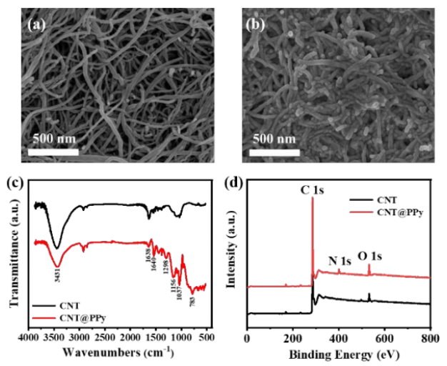 Figure 1. (a)獨(dú)立式CNT電極和(b)CNT@PPy復(fù)合材料電極的SEM圖像。 (c)CNT和CNT@PPy膜的FT-IR光譜。(d)CNT膜和CNT@ PPy膜的XPS全譜。