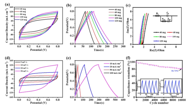 Figure 2. 不同電極的(a)在50 mV s-1掃速下的CV曲線和(b)20 mA cm-2時(shí)的GCD曲線。(c)電化學(xué)阻抗譜,頻率范圍為100 kHz至0.01 Hz,插圖顯示了對(duì)應(yīng)的等效電路。(d)CNT@PPy-100電極在不同掃描速率下的CV曲線。(e)不同電流密度下的GCD曲線。(f)CNT@ PPy-100的循環(huán)穩(wěn)定性能,插圖顯示了前5個(gè)GCD周期和最后5個(gè)GCD周期。