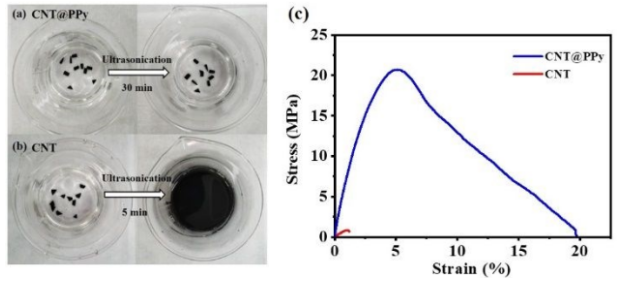 Figure 3.(a)超聲處理30分鐘前后CNT@PPy-100膜的差異。(b)超聲處理5分鐘前后CNT膜的差異。(c)純CNT和堅(jiān)固的CNT @ PPy-100膜的典型應(yīng)力-應(yīng)變曲線。