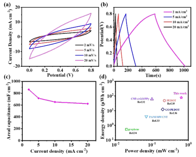 Figure 4. 所構(gòu)建器件的(a)CV曲線和(b)GCD曲線。(c)在不同電流密度下的面積電容比較。(d)所構(gòu)建超級(jí)電容器與最近報(bào)道的超級(jí)電容器的能量密度和功率密度比較。
