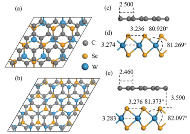Figure 1. 石墨烯/WSe2異質(zhì)結(jié)構(gòu)的兩種堆疊構(gòu)型。(a)模型A和(b)模型B的俯視圖;(c)孤立石墨烯和(d)WSe2單層接觸前的側(cè)視圖;(e)模型A的側(cè)視圖。