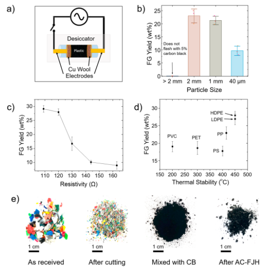 Figure 1. (a)120 V AC電路原理圖。(b)HDPE在不同粒徑時的AC-FG產量。(c)HDPE/CB混合物的初始電阻率對AC-FG產量的影響。(d)當初始電阻為120Ω時, 不同塑料廢棄物的AC-FG產量。(e)從塑料廢棄物變?yōu)镕G整個過程的照片。