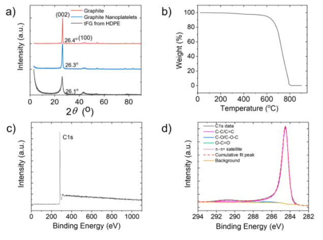 Figure 3. (a)來自HDPE的ACDC-tFG的XRD圖。(b)來自HDPE的ACDC-tFG的TGA曲線,和(c)ACDC-tFG的XPS總譜。(d)ACDC-tFG的高分辨率C 1s XPS光譜。