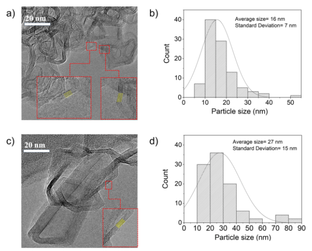 Figure 4. (a)AC-FG的TEM圖像,以及(b)AC-FG的顆粒尺寸分布(n = 100)。(c)ACDC-tFG的TEM圖像,(d)HDPE中ACDC-tFG的顆粒尺寸分布(n = 100)。