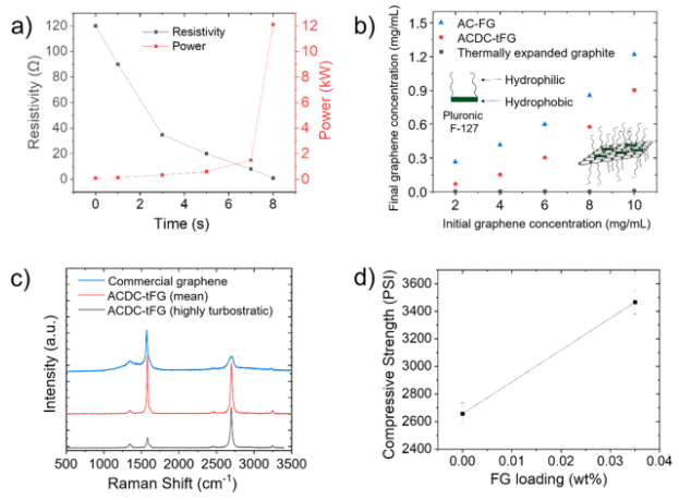 Figure 5. (a)AC-FJH過程中的電阻率值和功耗。(b)在離心前后,熱膨脹石墨,AC-FG和ACDC-tFG的浴超聲分散濃度。(c)ACDC-tFG和商用石墨烯的拉曼光譜。(d)水泥/ AC-FG復合材料的抗壓強度。