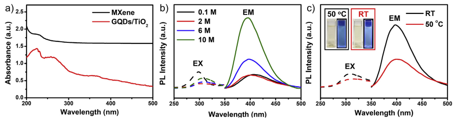 碳化物衍生的石墨烯量子點(diǎn)(GQDs)具有無毒、強(qiáng)大的集光能力和較大的表面積,因此在光致發(fā)光領(lǐng)域具有很高的潛力。為了經(jīng)濟(jì)有效且穩(wěn)定地生產(chǎn)GQDs,降低GQDs的合成溫度是一個(gè)很好的選擇,但仍然是一個(gè)很大的挑戰(zhàn)。在此,通過在室溫下控制MXene的KOH(水溶液)的反應(yīng)時(shí)間和濃度,獲得光致發(fā)光GQDs。這種簡(jiǎn)便且經(jīng)濟(jì)高效的方法可以生產(chǎn)GQDs/TiO