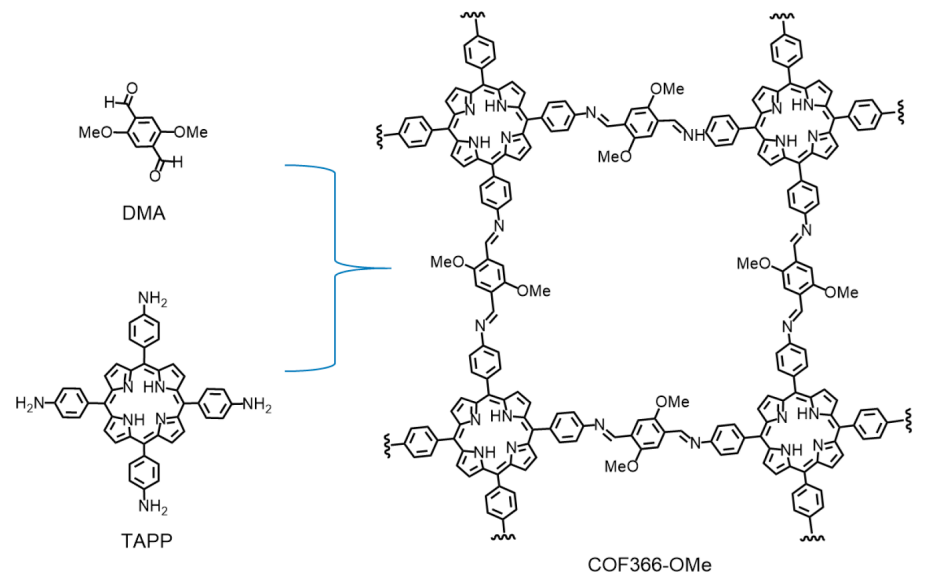 Figure 1. COF366-OMe COF及其構(gòu)建單元、DMA鏈接器和TAPP核的化學(xué)結(jié)構(gòu)