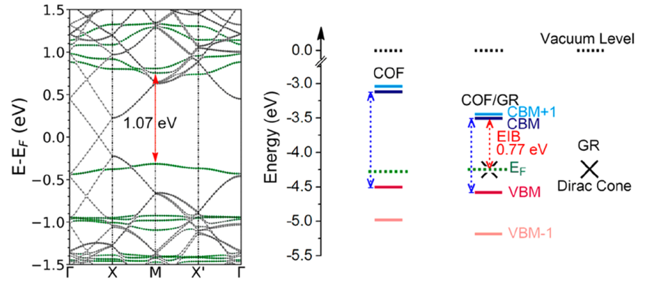 Figure 3. COF/石墨烯配合物的DFT/PBE-D3電子能帶結(jié)構(gòu)以及孤立的COF、孤立的石墨烯和COF/石墨烯配合物之間的能級比對
