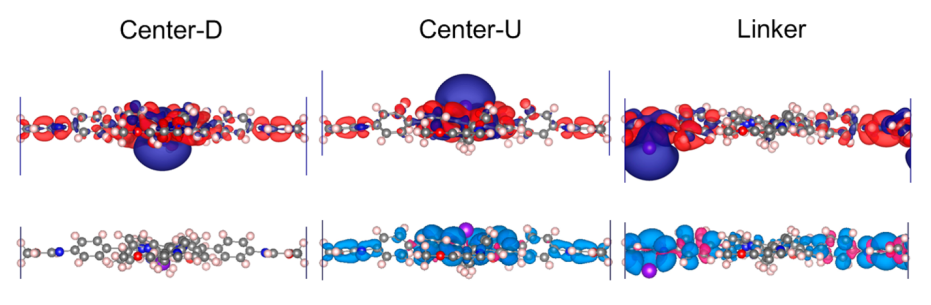 Figure 4. COF366-OMe的差分電荷密度(上圖)和自旋密度輪廓(下圖),作為Na原子吸附位置的函數(shù)