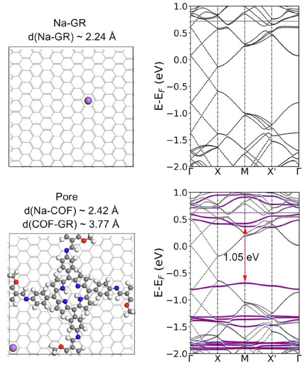 Figure 5. 鈉摻雜石墨烯的頂視圖和能帶結(jié)構(gòu)以及沉積在石墨烯上的鈉摻雜COF366-OMe的孔構(gòu)型