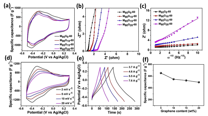 Figure 3. MXene-石墨烯雜化水凝膠在三電極結(jié)構(gòu)中的儲能性能