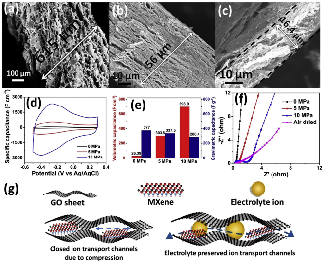 重量電容和體積電容是任何超級電容器設(shè)備的兩個重要參數(shù),但是迄今為止,在基于MXene電極的第一個品質(zhì)因數(shù)方面,只有中等程度的成就。在這項研究中,借助于少量(5 wt%)的石墨烯,已采用MXene的界面逐層自組裝技術(shù)來開發(fā)基于水凝膠的超級電容器電極,該電極在三電極設(shè)置中,2 mV/s時顯示出653.7 F/g的優(yōu)異重量電容。通過簡單調(diào)整諸如膠凝時間和電解質(zhì)保護的機械壓縮之類的各種條件,還可以獲得很高的面積(1442 mF cm
