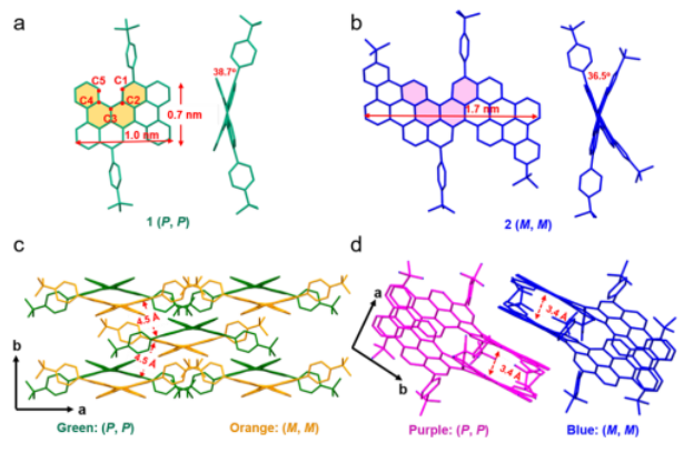 Figure 1. 樣品1和2的X射線晶體結(jié)構(gòu)。所有氫原子和溶劑分子被省略。(a,b)1(P,P)和2(M,M)樣品的俯視圖和側(cè)視圖。(c,d)樣品1和2的晶體結(jié)構(gòu)堆積。