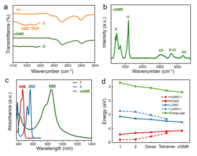 Figure 3. cGNR的光譜表征。(a)P1和cGNR的FTIR光譜。(b)cGNR在532 nm處測量的拉曼光譜。(c)cGNR在氯仿(0.1 mg mL-1)中的紫外可見吸收光譜,樣品1,2在DCM(10-5 M)中的紫外可見吸收光譜。(d)樣品1、2,二聚體,四聚體,cGNR的能級。