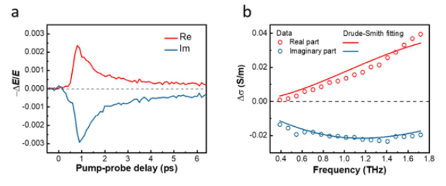 Figure 4. (a)光激發(fā)后,cGNR的時間分辨的太赫茲光電導(dǎo)率(與透射場的相對變化成正比)。(b)光激發(fā)后,在1.5 ps測量的頻率分辨的THz復(fù)電導(dǎo)率。