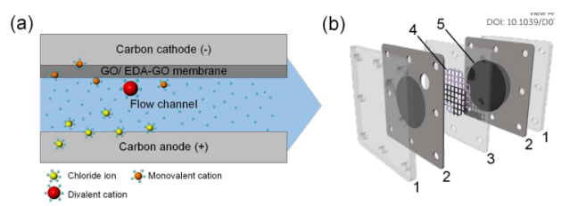 Figure 1. 通過GO/EDA-GO膜優(yōu)選吸附單價陽離子的示意圖。(b)CDI電池的分解圖以及各部分組件。