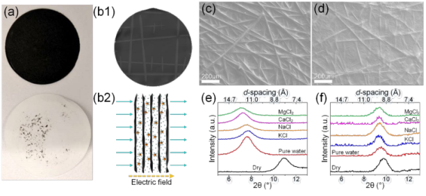 Figure 2.(a)從PTFE膜過濾器分離EDA-GO膜的照片。(b1)示意圖顯示了GO/EDA-GO膜。(b2)示意圖說明了隨電場變化,d-間距調制跨膜陽離子流動,朝相同的方向移動。(c)GO和(d)EDA-GO膜的SEM圖。(e)GO和(f)EDA-GO膜在干燥狀態(tài)下的XRD結果。