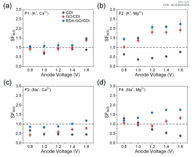 使用二維(2D)層狀膜精確和可選擇性地分離離子是一個新興的研究領域,其在水處理,海水淡化,傳感,仿生和能量存儲等領域都有潛在的應用。但是,大多數(shù)實驗是圍繞壓力或濃度驅動的分離過程來研究,而沒考慮離子種類的帶電性質。這里,通過對2D氧化石墨烯基(GO-基)膜施加電場,證明了通過改變電場極性或增加電場強度,可以增強離子選擇性。與傳統(tǒng)滲透實驗相反,選擇性不僅受限于膜本身,還可以通過改變施加的電場強度來調整。這里利用一價和二價鹽溶液,探究了兩種膜。第一種是傳統(tǒng)未修飾的GO膜,第二種是d間距受乙二胺(EDA)官能化限制的GO膜。分離單價離子時,使用EDA-GO膜其選擇性達到1.5–5,而GO膜對應的選擇性為1.3 – 3.56。使用密度泛函理論(DFT)計算,確定了EDA的存在可以增強K +和Na +絡合物的形成,促使局部層間距離錯亂。