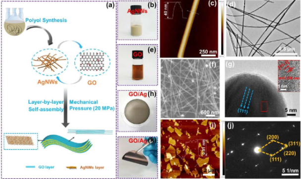 Figure 1. (a)GO/Ag薄膜的制備示意圖,(b)Ag納米線和(e)GO的數(shù)字照片,(c)Ag納米線和(i)GO的AFM圖,(f)Ag納米線的SEM圖,(d,g)Ag納米線的HRTEM圖,(j)Ag納米線的SAED圖,(h,k)GO/Ag薄膜的數(shù)字照片。