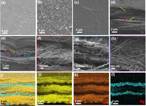 Figure 2. 純Ag NWs膜(a),GO/Ag-PM膜(b)和(c)GO / Ag-5L膜的SEM圖。(d)GO/Ag-5L薄膜的SEM截面圖。(e-h)在不同位置的放大橫截面SEM圖。(i-1)GO/Ag-5L膜中元素的映射圖。