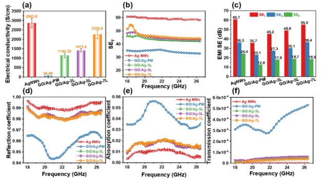 在軍事和民用領(lǐng)域,探索超寬頻電磁屏蔽材料,以消除來自電子設(shè)備的各種頻率電磁干擾,仍是一項(xiàng)巨大的的挑戰(zhàn)。這里,通過真空輔助自組裝,構(gòu)造了獨(dú)立式氧化石墨烯/銀納米線(GO/Ag-7L)膜,其具有密集的三明治狀結(jié)構(gòu)。與機(jī)械混合膜的隨機(jī)分布相比,多層GO/Ag-7L膜中,銀納米線被編織成3D導(dǎo)電網(wǎng)絡(luò)結(jié)構(gòu),具有出色的導(dǎo)電性(2255.8S/cm)。受益于GO的多層結(jié)構(gòu)具有多次吸收,以及銀納米線網(wǎng)絡(luò)的多次反射,在8-40 GHz的超寬頻范圍(覆蓋X波段,Ku波段,K波段,和Ka波段),其干擾屏蔽效率(EMI SE)高達(dá)62 dB(厚度僅為8微米)。相應(yīng)的比SE(EMI SE/t)高達(dá)77500 dB/cm。插入GO層后,GO/Ag-7L膜表現(xiàn)出出色的柔韌性和防腐蝕性能??紤]到實(shí)際應(yīng)用,可以將其用作新穎的應(yīng)變傳感器,具有高靈敏度和快速應(yīng)變響應(yīng),應(yīng)用于機(jī)器人,既滿足電磁干擾保護(hù)要求又滿足實(shí)時(shí)運(yùn)動(dòng)監(jiān)控。因此,它在精密的電子設(shè)備中具有廣闊的應(yīng)用前景。
