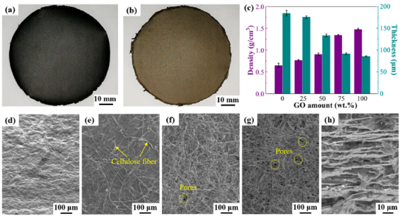 Figure 2. GO-纖維素膜的形貌:(a)75 wt%的GO膜和(b)25 wt%的GO膜的光學圖像;(c)GO-纖維素膜在不同GO含量時的密度和厚度;(d-g)100、75、50,和25wt%的GO膜的SEM圖;(h)25 wt%GO膜的橫截面SEM圖像。