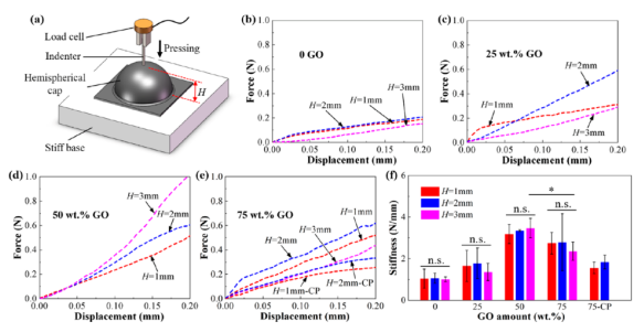 Figure 3. 在中心使用壓力點對壓印的半球形帽進行剛度測試:(a)實驗裝置示意圖,(b-e)不同GO含量時的力-位移曲線;(f)不同GO含量時的硬度和樣品高度H。