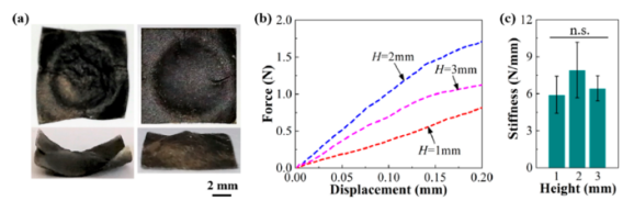 Figure 4. GO-纖維素半球形帽的硼砂交聯(lián):(a)硼砂交聯(lián)的75 wt%GO帽的光學圖像(左側:壓印后交聯(lián)狀態(tài);右側:壓印過程時的交聯(lián)狀態(tài));(b)硼砂交聯(lián)的75 wt%GO帽的力-位移曲線;(c)交聯(lián)后75 wt%GO帽的剛度。