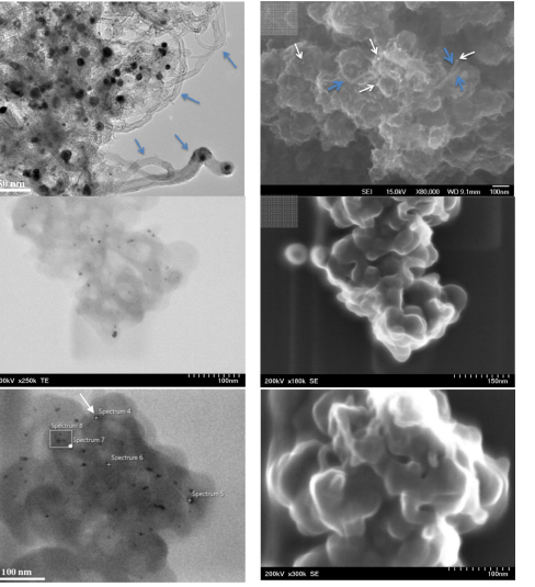 Figure 1. (a,b)特殊純化之前的GrPt復(fù)合材料的TEM和SEM圖像;經(jīng)過(guò)特殊純化的納米復(fù)合材料的(c,e)TEM和(d,f)SEM圖像