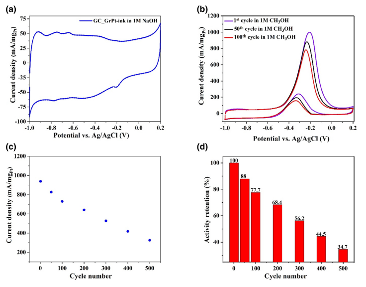 3OH/1 M NaOH溶液中。(d)在1 M堿性甲醇溶液中經(jīng)過(guò)500次循環(huán)后,評(píng)估GC_GrPt-ink電極的活性保留率(%)。