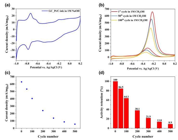 3OH/1 M NaOH溶液中。(d)在1 M堿性甲醇溶液中經(jīng)過(guò)500次循環(huán)后,評(píng)估GC_Pt/C-ink電極的活性保留率(%)。