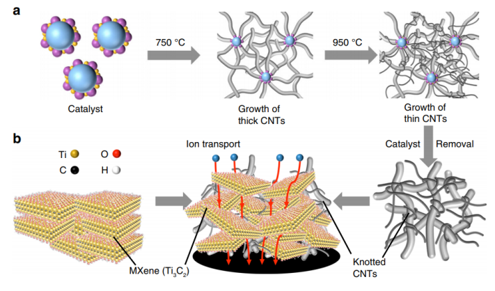 改善電化學(xué)能量存儲(chǔ)設(shè)備的電極中離子的傳輸性,對(duì)于電荷存儲(chǔ)和倍率性能至關(guān)重要。尤其在低工作溫度下,有機(jī)電解質(zhì)中離子遷移的動(dòng)力學(xué)很慢。本文中,我們報(bào)告了一種新型的MXene-碳納米管(CNT)復(fù)合電極,該電極可最大程度地提高離子的可及性,從而在低溫下具有出色的倍率性能。通過使用特別設(shè)計(jì)的CNTs打結(jié),打破MXene Ti