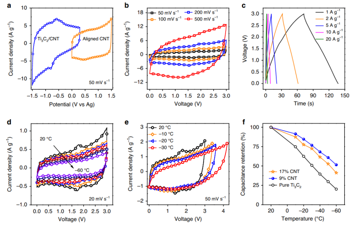 -3)),并具有高電容保持率。該研究也是第一個(gè)在低溫(低至- 60°C)下使用MXene基超級(jí)電容器的報(bào)告。