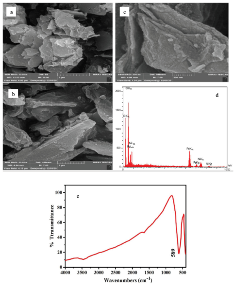 4-rGO納米復(fù)合物的(a–c) SEM圖、(d) EDX分析和(e) FT-IR圖